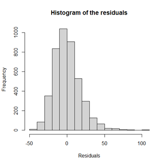 hist(resid(fit5), main=”Histogram of the residuals”, xlab=”Residuals”)