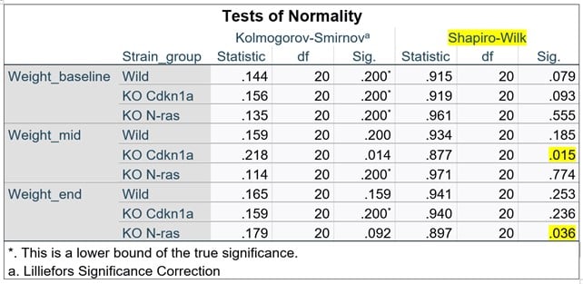 Two of the weight variables are statistically significant different from a Gaussian or normal distribution (The Cdkn1a KO mice at the mid-point, and the N-RAS KO mice at the end of the trial). This would mean we need to use non-parametric tests when analysing these data.