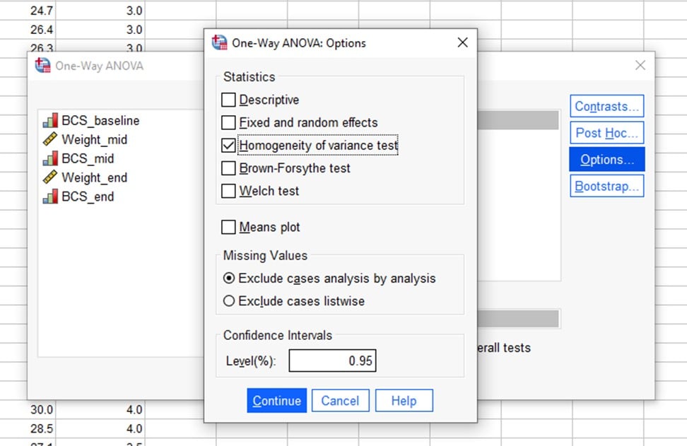 Click on ‘Options’ and tick the box next to ‘Homogeneity of variance test’.