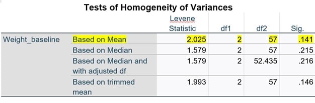 If we were considering a parametric test for these data, the row we would be interested in is the top one ‘Based on Mean’. This row tells us that there is no statistically significant difference in variance about the mean for the three groups, so this assumption is met.